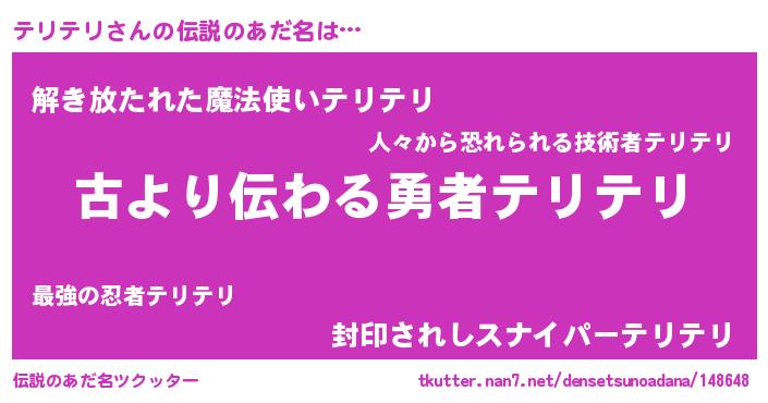 | 男性向けラノベタイトル風あだ名 | 『テリテリという概念が存在しない退屈な世界 』 |