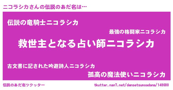 | 男性向けラノベタイトル風あだ名 | 『ニコラシカに滅ぼされるだけの簡単なお仕事です』 |