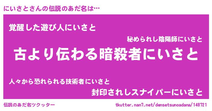 | 男性向けラノベタイトル風あだ名 | 『転生したらにいさとだった件』 |