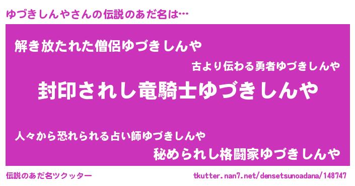 | ヒーロー風カッコイイあだ名 | 『スーパーユヅキシンヤ』『銀牙騎士ユヅ』 |