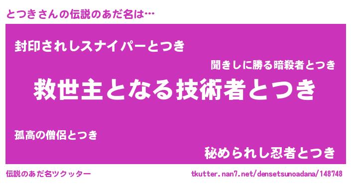 | 男性向けラノベタイトル風あだ名 | 『とつきに滅ぼされるだけの簡単なお仕事です』 |