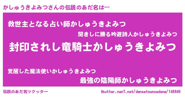 | 男性向けラノベタイトル風あだ名 | 『うちのかしゅうきよみつが世界を掌握している!』 |