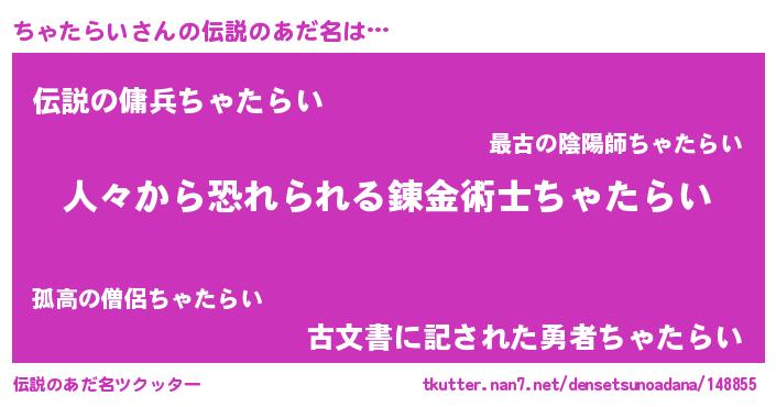 | ヒーロー風カッコイイあだ名 | 『正義の使者ちゃたらい』『魔戒騎士チャ』 |