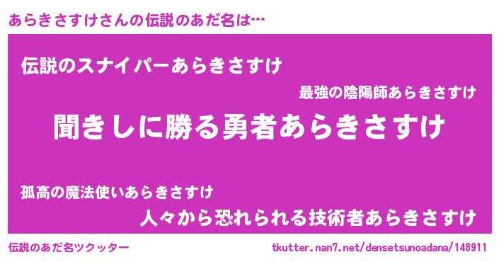 | 男性向けラノベタイトル風あだ名 | 『あらきさすけという概念が存在しない退屈な世界 』 |