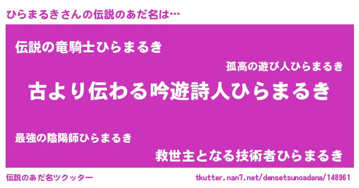 | ヘコむあだ名 | 『ひらまるき(笑)』『ひらにー』 |