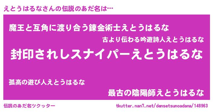 | 男性向けラノベタイトル風あだ名 | 『エトウハルナアートオンライン』 |