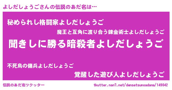 | 女子向けラノベタイトル風あだ名 | 『異世界で失敗しない100のよしだしょうご』 |