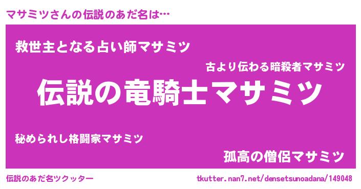 | ヒーロー風カッコイイあだ名 | 『仮面マサダー』『超時空戦士マサミツ』 |