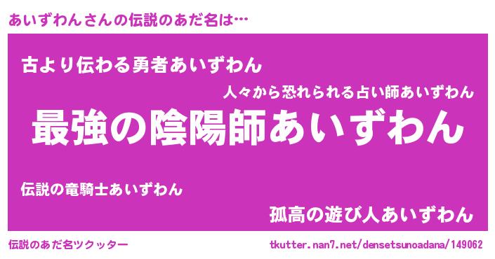 | 男性向けラノベタイトル風あだ名 | 『あいずわん~年齢イコール彼女いない歴の魔法使い~』 |