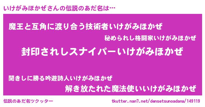 | 男性向けラノベタイトル風あだ名 | 『イケガミホカゼアートオンライン』 |