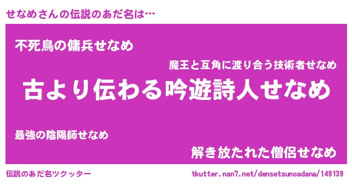 | 男性向けラノベタイトル風あだ名 | 『せなめという概念が存在しない退屈な世界 』 |