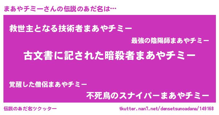 | 恥ずかしいあだ名 | 『マアヤチミーデラックス』『まあちん』 |