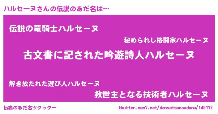| 意味不明あだ名 | 『自称ハルセーヌ』『永久保存ハルセーヌ』 |