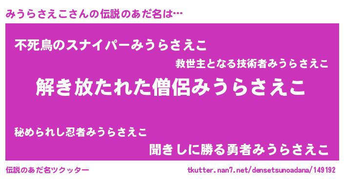 | 女子向けラノベタイトル風あだ名 | 『みうらさえこの卵を拾いまして』 |