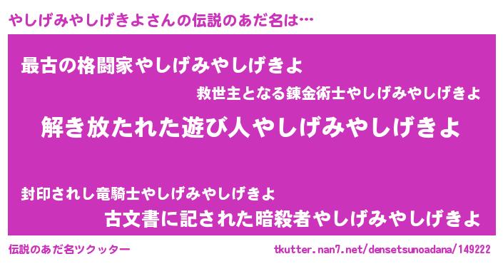 | 欧米人風あだ名 | 『やしげみやしげきよ・ステッグマイヤー』 |