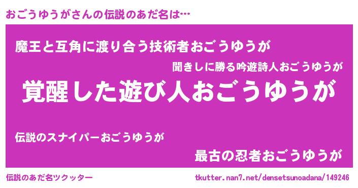 | ヒーロー風カッコイイあだ名 | 『炎刃騎士オゴ』『愛の使者おごうゆうが』 |