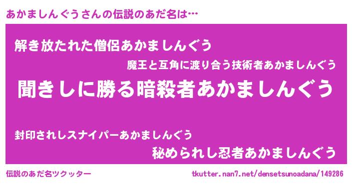 | 意味不明あだ名 | 『住所不定無職あかましんぐう(40歳)』 |
