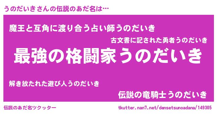 | 男性向けラノベタイトル風あだ名 | 『この素晴らしい世界にうのだいきを!』 |