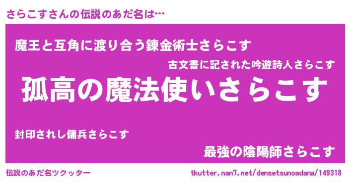 | 意味不明あだ名 | 『自称さらこす』『さらこすフォーエバー』 |