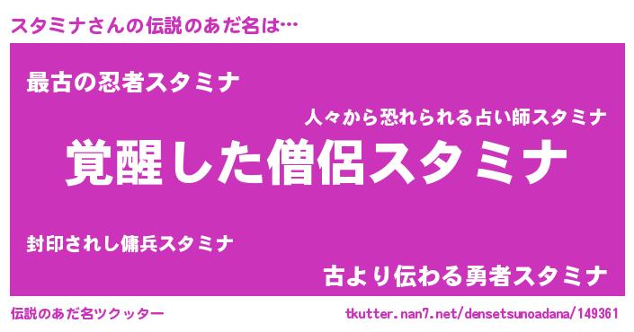 | 男性向けラノベタイトル風あだ名 | 『スタミナの嫁は女の子じゃないと思った?』 |