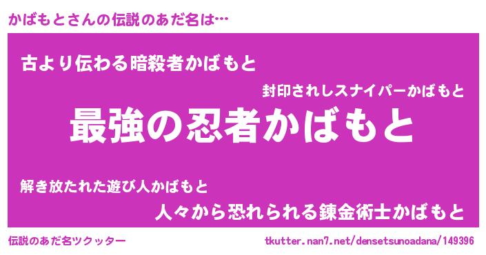 | ヒーロー風カッコイイあだ名 | 『ウルトラかばもとマン』『ネオカバモト』 |