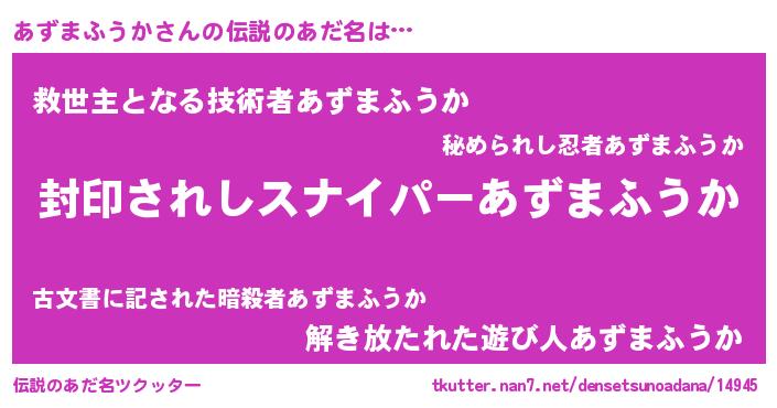 | ヒーロー風カッコイイあだ名 | 『スーパーアズマフウカ』『仮面アズダー』 |