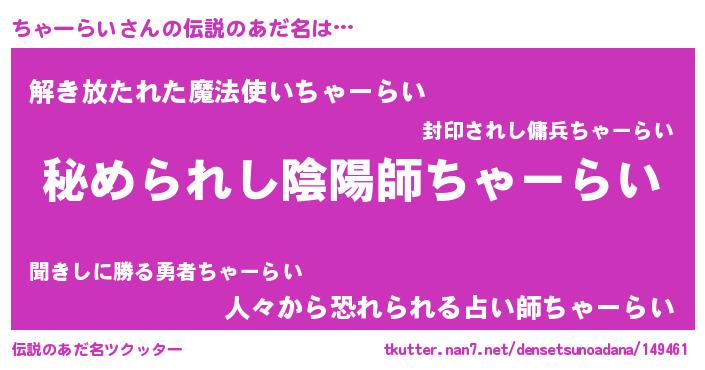 | 意味不明あだ名 | 『住所不定無職ちゃーらい(71歳)』 |
