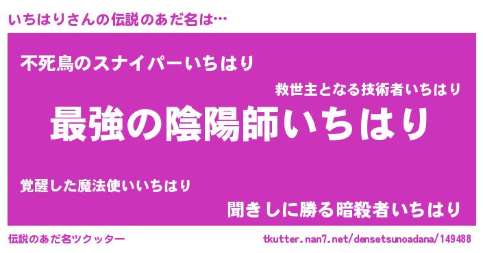 | 男性向けラノベタイトル風あだ名 | 『うちのいちはりが世界を掌握している!』 |