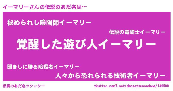 | 男性向けラノベタイトル風あだ名 | 『イーマリーの嫁は女の子じゃないと思った?』 |