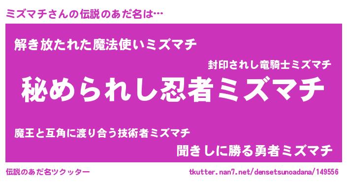 | ヒーロー風カッコイイあだ名 | 『ウルトラ戦士ミズマチ』『仮面ミズダー』 |