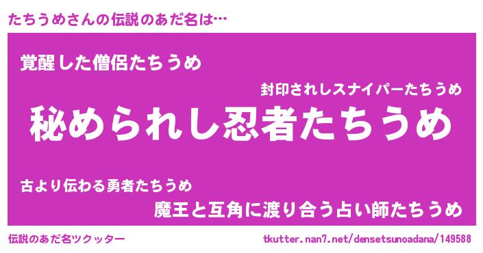 | ヒーロー風カッコイイあだ名 | 『仮面タチダー』『ウルトラたちうめマン』 |