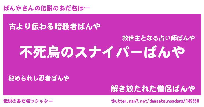 | 男性向けラノベタイトル風あだ名 | 『転生したらばんやだった件』 |
