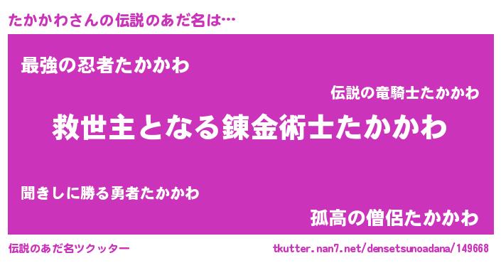 | 男性向けラノベタイトル風あだ名 | 『たかかわに滅ぼされるだけの簡単なお仕事です』 |