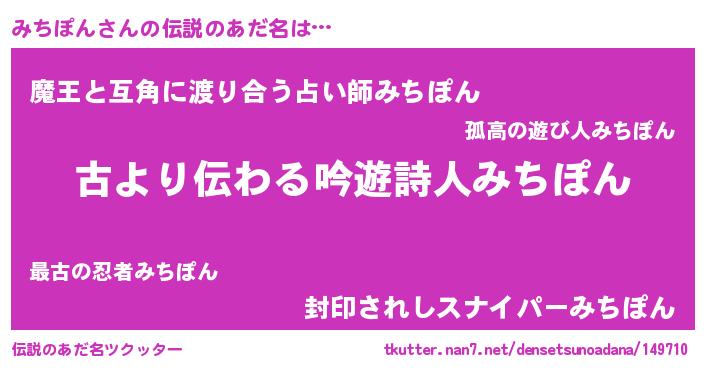 | 女子向けラノベタイトル風あだ名 | 『みちぽんの契約王妃』『闇のみちぽん』 |