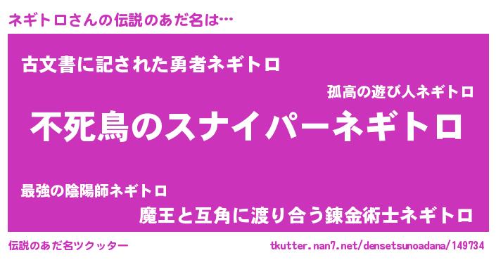 | 男性向けラノベタイトル風あだ名 | 『Re:ネギトロから始める異世界生活』 |