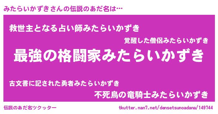 | 胡散臭い通販商品みたいなあだ名 | 『あなたにだけ特別に提供する100年もののヴィンテージワイン…その名も「みたらいかずき」』 |