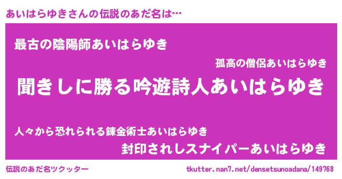 | ヘコむあだ名 | 『あいはらゆき(小並感)』『豆乳』 |