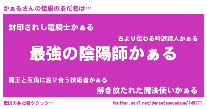 | 男性向けラノベタイトル風あだ名 | 『うちの娘の為ならば、俺はもしかしたらかぁるも倒せるかもしれない。』 |