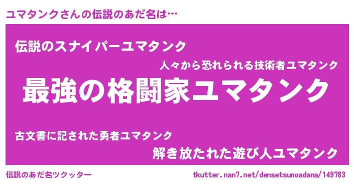 | 意味不明あだ名 | 『ユマタンクフォーエバー』 |