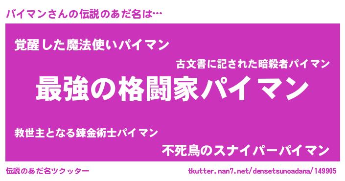 | 男性向けラノベタイトル風あだ名 | 『うちのパイマンが世界を掌握している!』 |