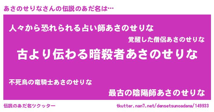 | 男性向けラノベタイトル風あだ名 | 『あさのせりなという概念が存在しない退屈な世界 』 |