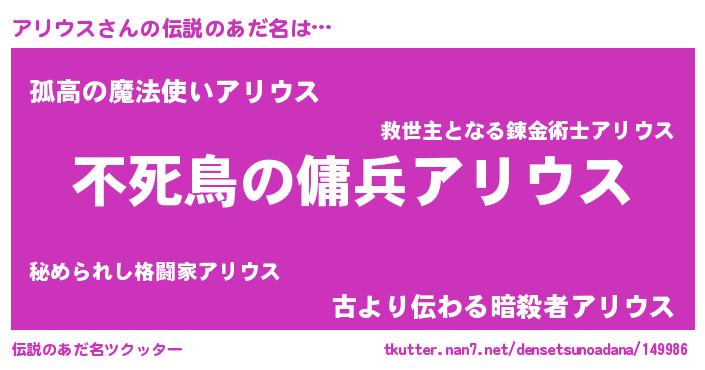 | 男性向けラノベタイトル風あだ名 | 『アリウスの憂鬱』『魔弾の王とアリウス』 |