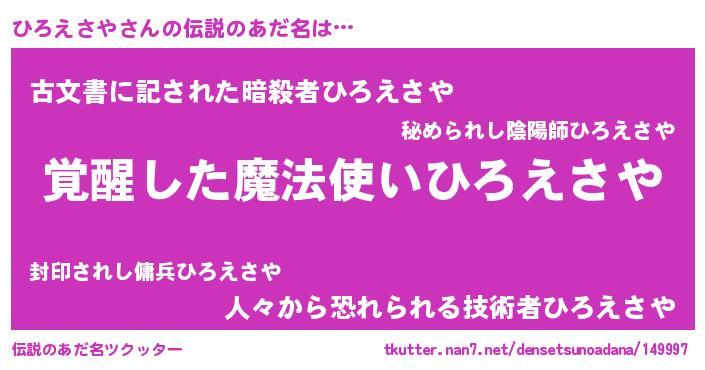 | 男性向けラノベタイトル風あだ名 | 『ひろえさや~年齢イコール彼女いない歴の魔法使い~』 |