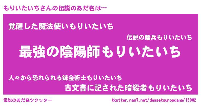 | 男性向けラノベタイトル風あだ名 | 『もりいたいち~年齢イコール彼女いない歴の魔法使い~』 |