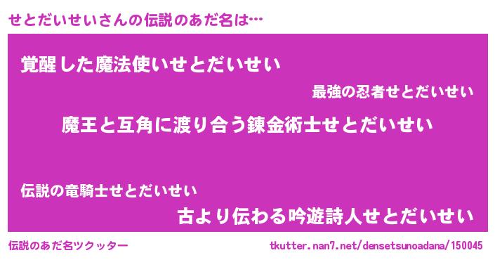 | ヘコむあだ名 | 『せとぷりん』『せとだいせい(遠い目)』 |