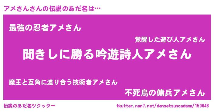 | 男性向けラノベタイトル風あだ名 | 『アメさんという概念が存在しない退屈な世界 』 |