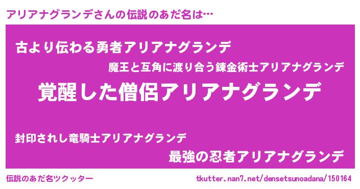 | 男性向けラノベタイトル風あだ名 | 『アリアナグランデに滅ぼされるだけの簡単なお仕事です』 |