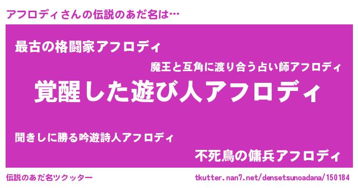 | ヒーロー風カッコイイあだ名 | 『天弓騎士アフ』『最強戦士アフロディ』 |