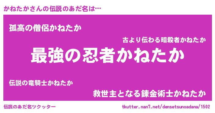 | 男性向けラノベタイトル風あだ名 | 『うちのかねたかが世界を掌握している!』 |