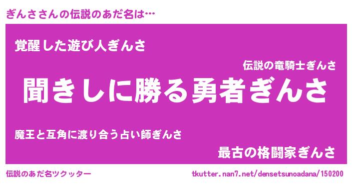 | 男性向けラノベタイトル風あだ名 | 『緋弾のギンサ』『魔弾の王とぎんさ』 |